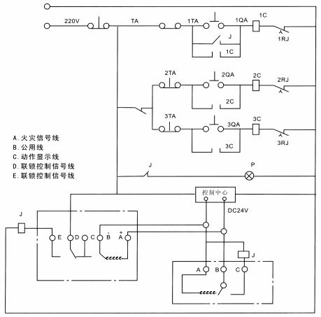 3、 如要選雙微動開關時,無論是手動控制還是控制中心發出DC24V電訊號控制都能使排煙風機(或加壓送風機)、排風機、空調風機聯動。此時繼電器J的控制電壓為AC220V,若選單微動開關時,控制中心發出DC24V電訊號,可以聯動排煙風機(或加壓送風機),如手動使防火排煙閥動作要等到控制中心得到火警發出DC24V電訊號后才能聯動其它設備,否則要人為按動2QA、3QA、2TA按鈕。